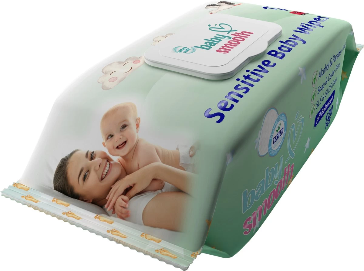 Baby Smooth Sensitive billendoekjes, De milde reinigingslotion van de doekjes reinigt en verzorgt de gevoelige babybilletjes. De doekjes maken de handjes, billetjes en gezichtje gemakkelijk schoon. De doekjes bevatten geen alcohol waardoor ze geschikt zijn voor de gevoelige baby- en kinderhuid.