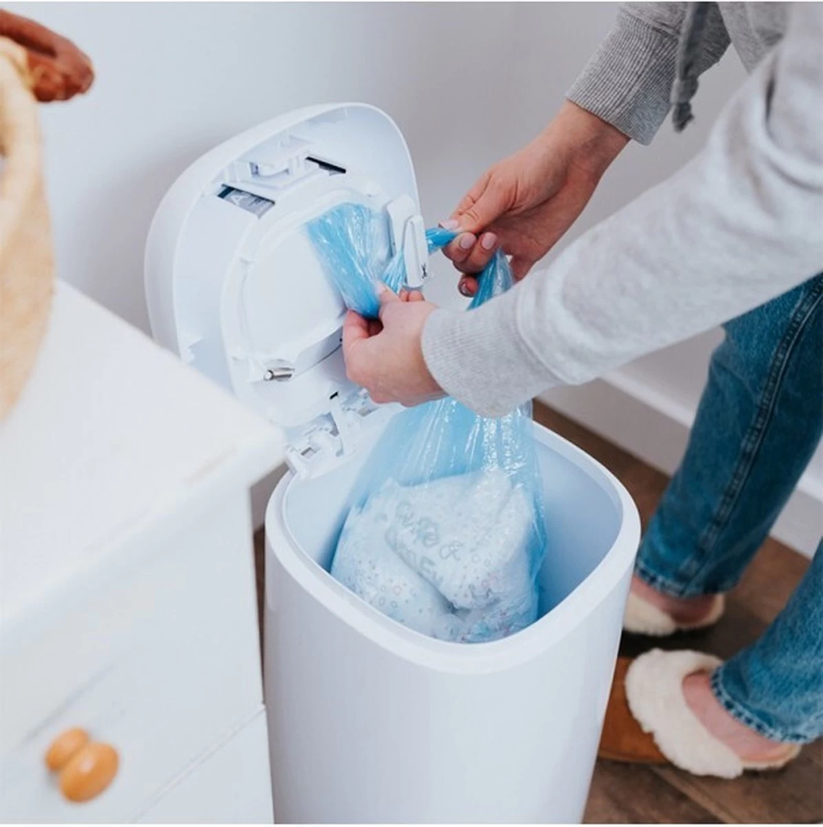 Ook handig: je kan de luieremmer makkelijk bedienen met 1 hand!