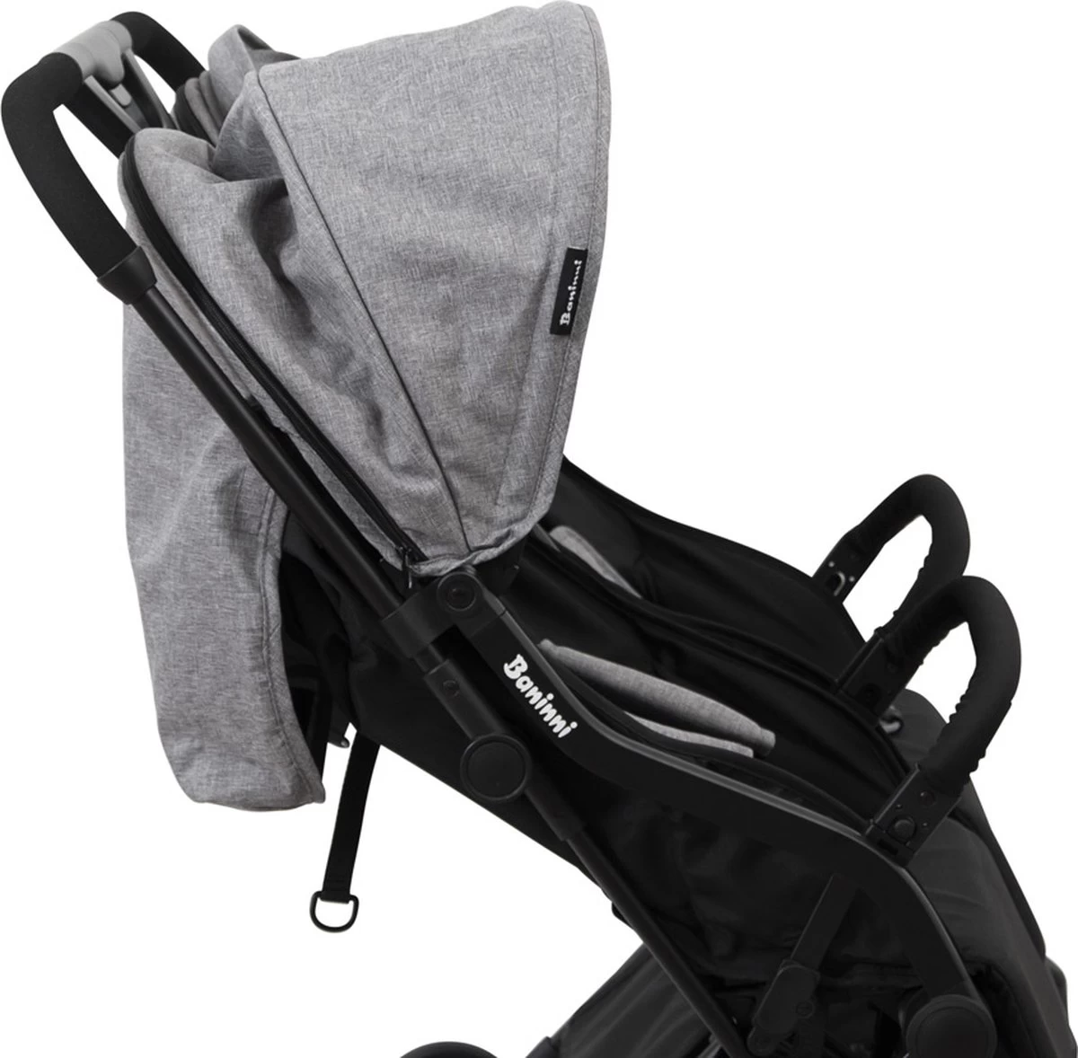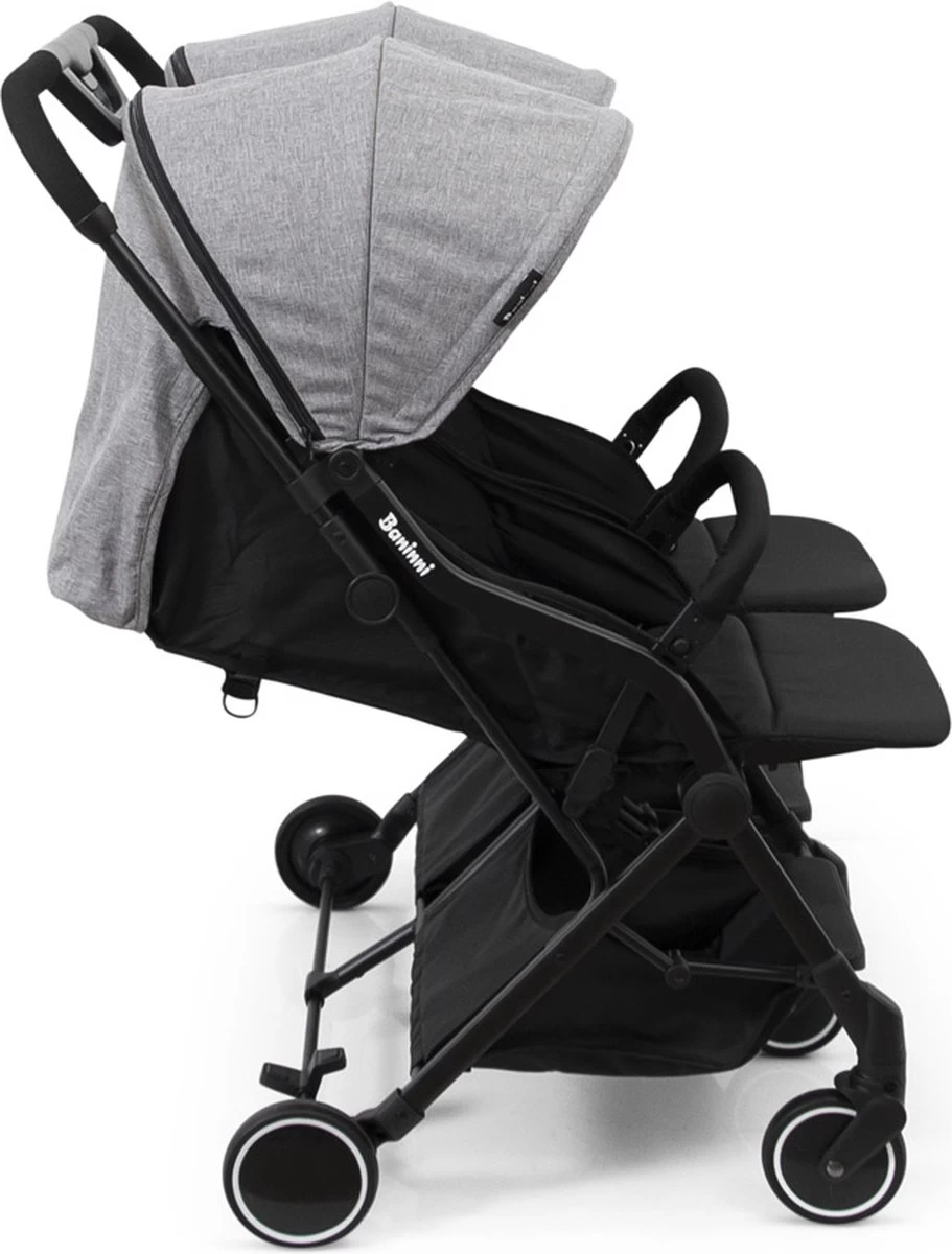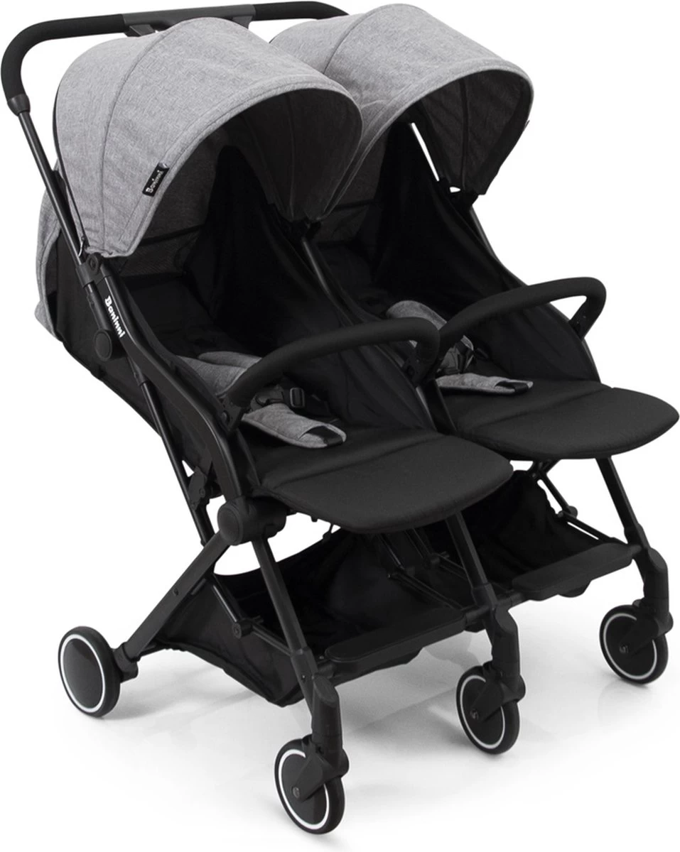 De Adige duo buggy van Baninni is een side-by-side wandelwagen voor duo’s en tweelingen. Voor optimaal gebruiksgemak is de lichtgewicht buggy is in en uit te vouwen met één hand. Ook is de duo buggy 76 cm breed waardoor hij door standaard deuropening kan. De buggy is compact inklapbaar en kan daardoor makkelijk opgeborgen worden. De rugleuningen van deze dubbele wandelwagen kunnen afzonderlijk versteld worden en ook de voetensteunen kan je aanpassen. De trendy bekleding geeft de Adige een trendy look. Elk zitje is voorzien van een 5-puntsgordel en een afneembare voorbeugel. In de boodschappenmandjes onderaan kan je een luiertas of speelgoed bij de hand houden. De Adige duo buggy is geschikt voor kinderen van 0 tot 36 maanden en kan een maximaal gewicht dragen van 15 kg per zitje. Kenmerken Baninni Adige duo buggy: Duo wandelwagen, In- en uitvouwen met één hand, Breedte 76 cm: past door standaard deuren, Compact inklapbaar, Afzonderlijk verstelbare rugleuning, Afzonderlijk verstelbare voetensteun, Afzonderlijk verstelbare zonnekap, Afneembare voorbeugel, 5-puntsgordel, Boodschappenmand, 0 – 36 maanden (max. 15kg per zitje), Zwenkwielen met rubberen band, Centraal remsysteem, Afmetingen open: 76 cm x 86 cm x 105 cm, Afmetingen dicht: 76 cm x 26 cm x 64 cm, Gewicht product: 11,6 kg