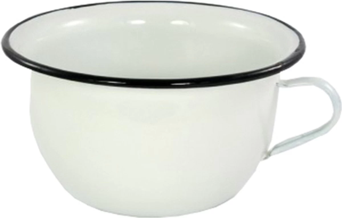 Ouderwetse emaille po met deksel. Zware kwaliteit emaille. Afmetingen: Ø binnenzijde 19 cm, Ø buitenzijde 22 cm en diepte is 12 cm. De po heeft een zwarte rand.