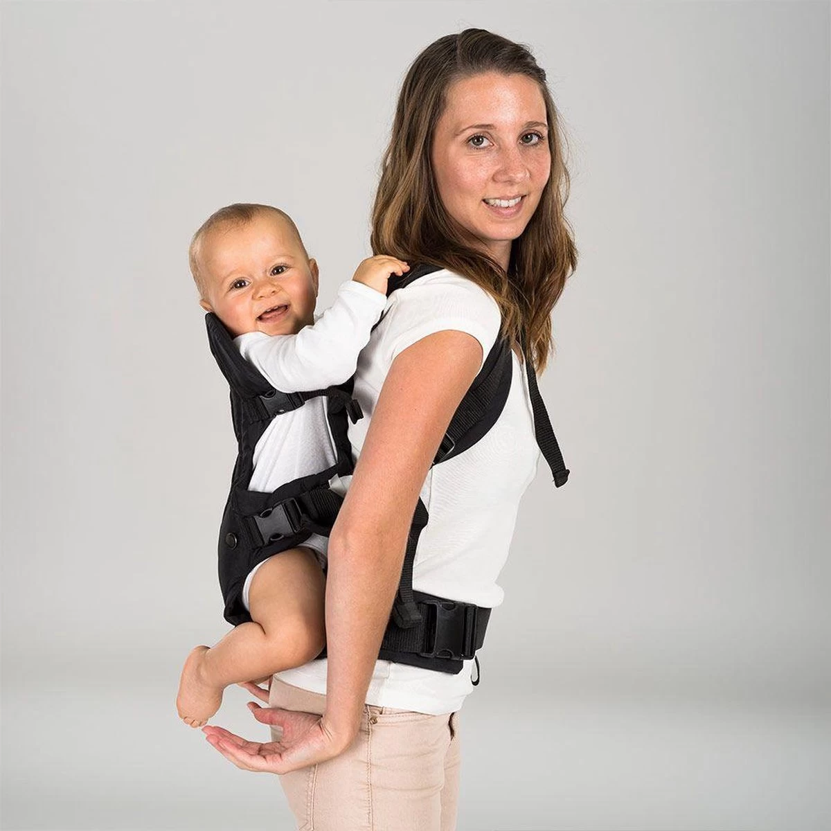 - 4 ergonomische posities – De ergonomische draagzak kan veilig vanaf de geboorte worden gebruikt, omdat hij de juiste ‘kikkerhouding’ of ‘M-positie’ voor zuigelingen ondersteunt. Als je baby ouder is kan het of op de buik naar binnen en naar buiten gericht worden gedragen, op de buik met licht gekantelde benen worden gedragen of op de rug worden gedragen.