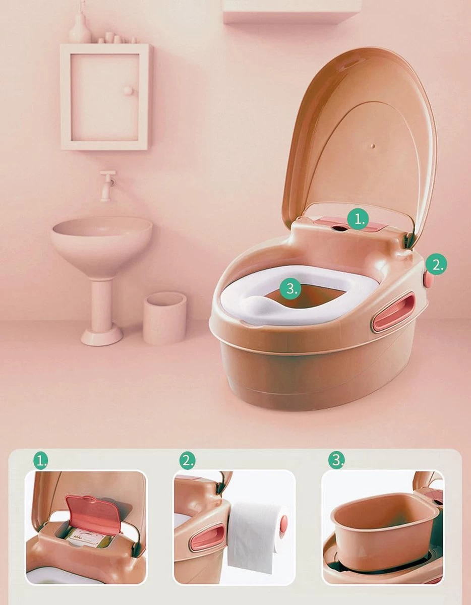 Er is ook een ingebouwde opbergruimte voor tissues en een inschuifbare wc-rol houder. Bovendien helpt de geïntegreerde spatbescherming (dat echt op zijn plaats blijft, hoera!) om spatten & morsen te voorkomen, wel zo hygiënisch en fris! Doordat het potje zelf makkelijk uit te nemen is en is gepolijst is het potje erg makkelijk schoon te maken.