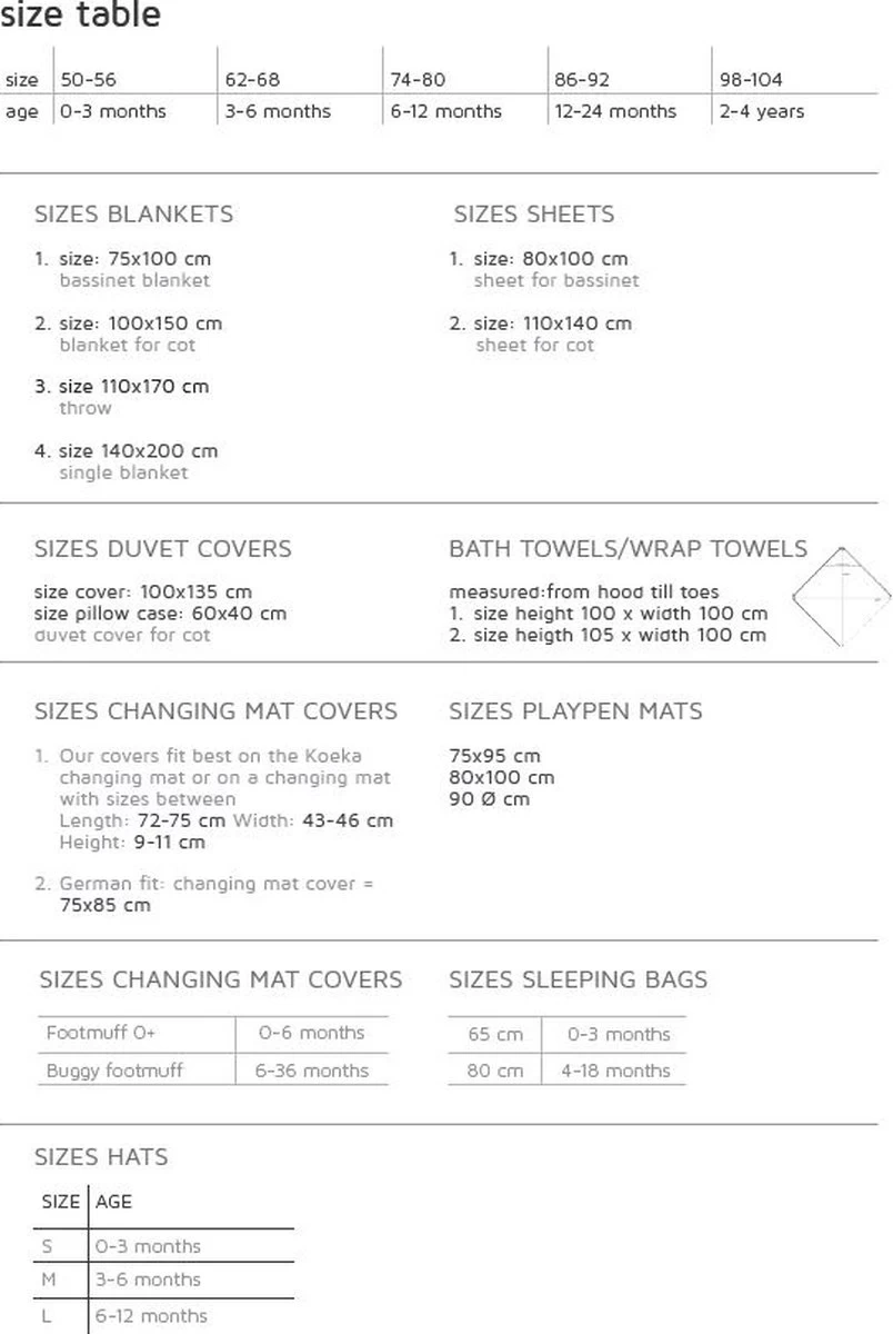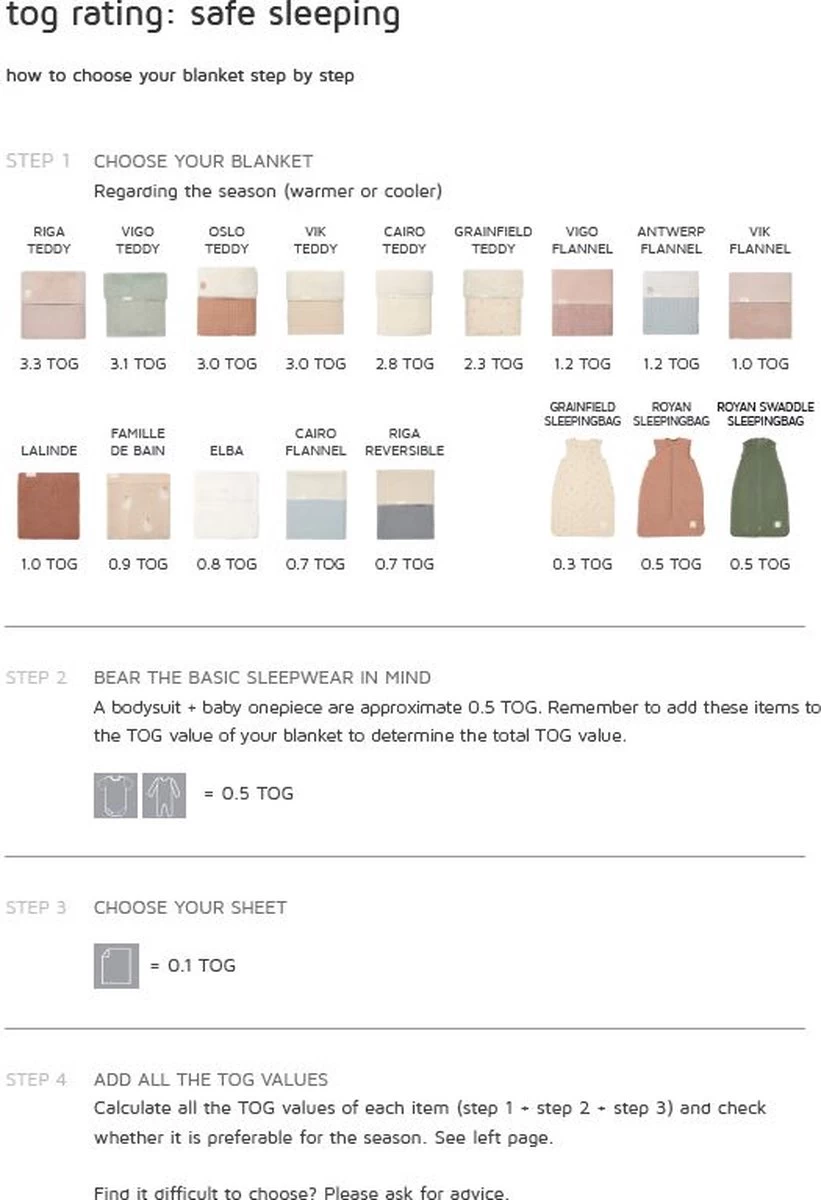 Wij snappen dat het lastig kan zijn om te bepalen welke deken je nu het beste kunt kopen. De juiste keuze hangt af van een aantal factoren en daarom heeft Koeka een keuzehulp samengesteld om je op weg te helpen. Deze “How to choose your blanket” keuzehulp vind je tussen de afbeeldingen. Meet de kamertemperatuur van je kinderkamer en bepaal wat de TOG waarde is van de slaapzak, pyjama en lakentje (als je die gebruikt). Raadpleeg daarna de keuzehulp om te bepalen wat het advies is voor de minimale en maximale TOG waarde van je deken.