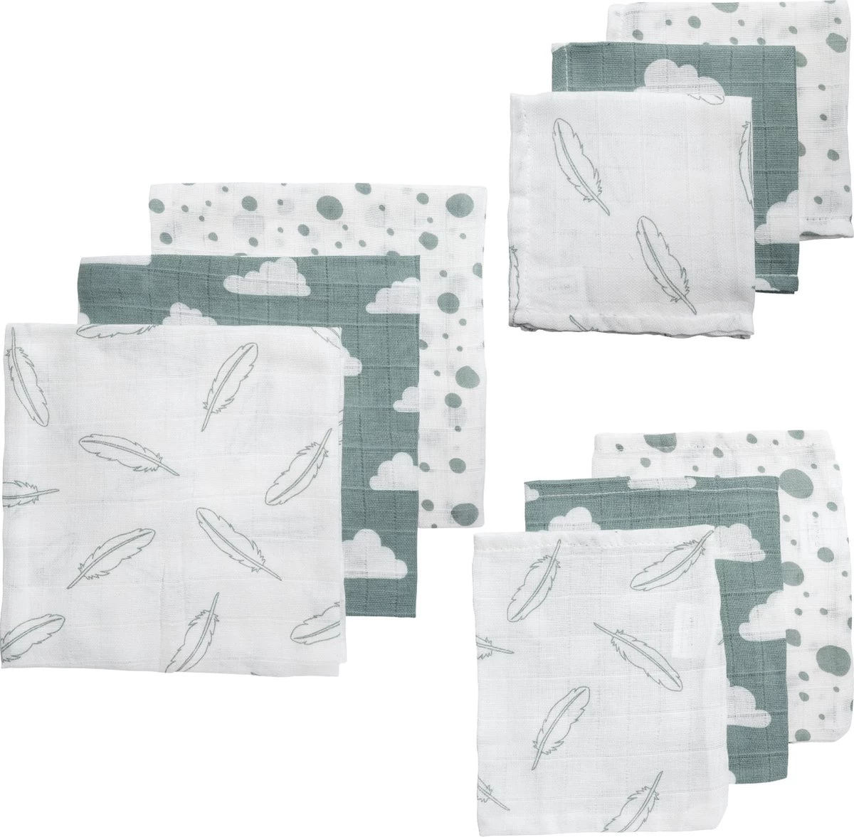 Meyco Clouds/Dots/Feathers Starterset – 9-pack – Hydrofiel – Stone Green
