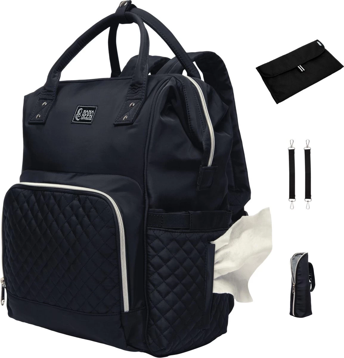 Praktisch en met een zeer luxe uitvoering is deze luiertas een must have voor iedere moeder! De NanaBeebi® luiertas biedt de handigste en meest functionele oplossing wanneer je buiten bent met je baby.