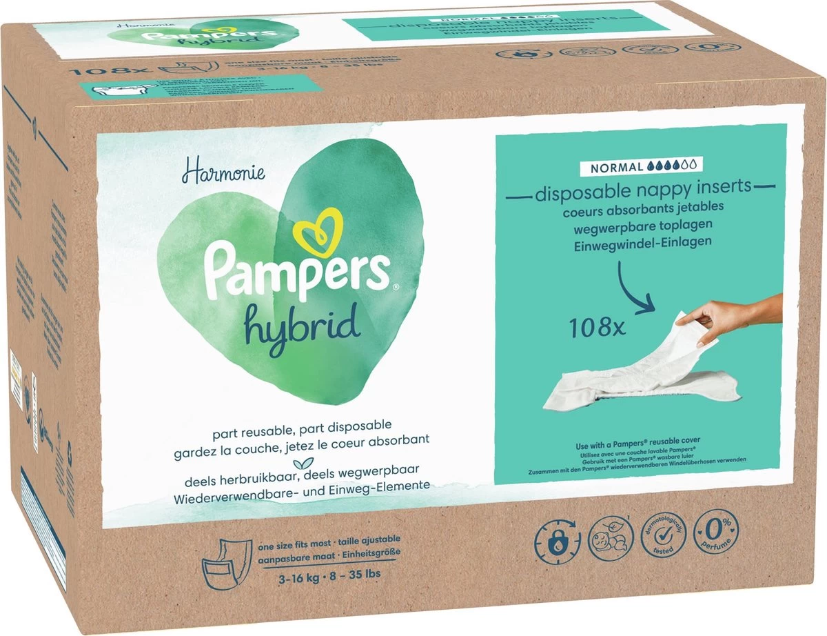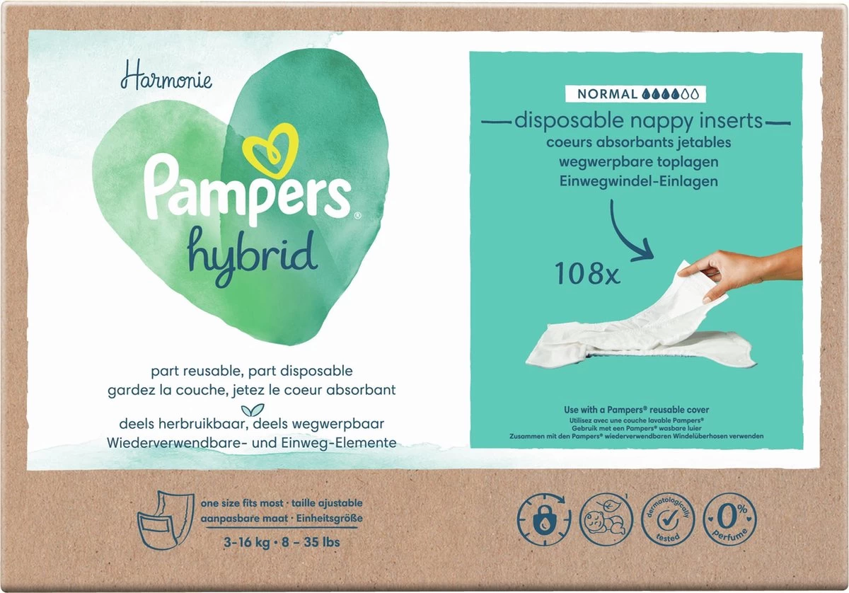 Pampers Harmonie Hybrid absorberende wegwerpbare toplagen zijn ontworpen om te worden gebruikt met de Pampers wasbare luier voor bescherming rondom tegen lekken. Ze helpen de gevoelige huid van je baby te beschermen – ze zijn gemaakt met materialen die zachte, plantaardige vezels bevatten. 0% parfum, en ultrazachte materialen. Ze zijn hypoallergeen en dermatologisch getest voor de gevoelige huid van je baby, en gemaakt met 100% aangekochte gecertificeerde hernieuwbare elektriciteit*.