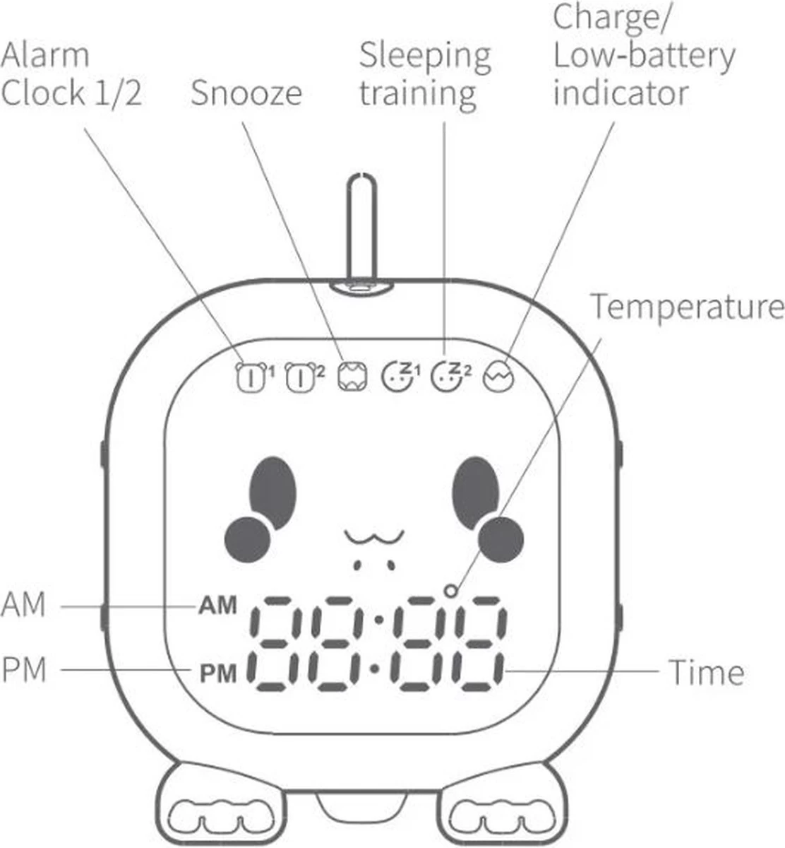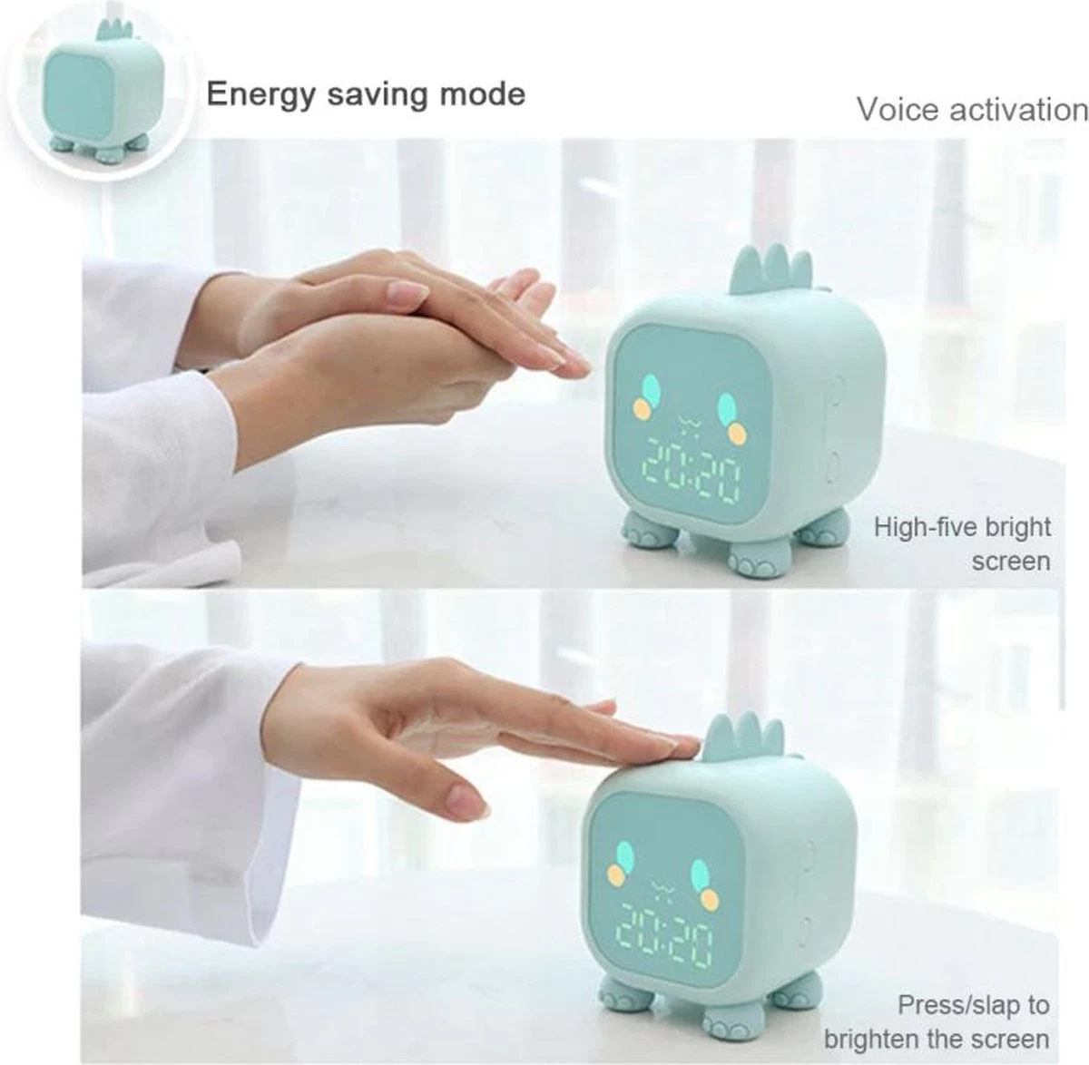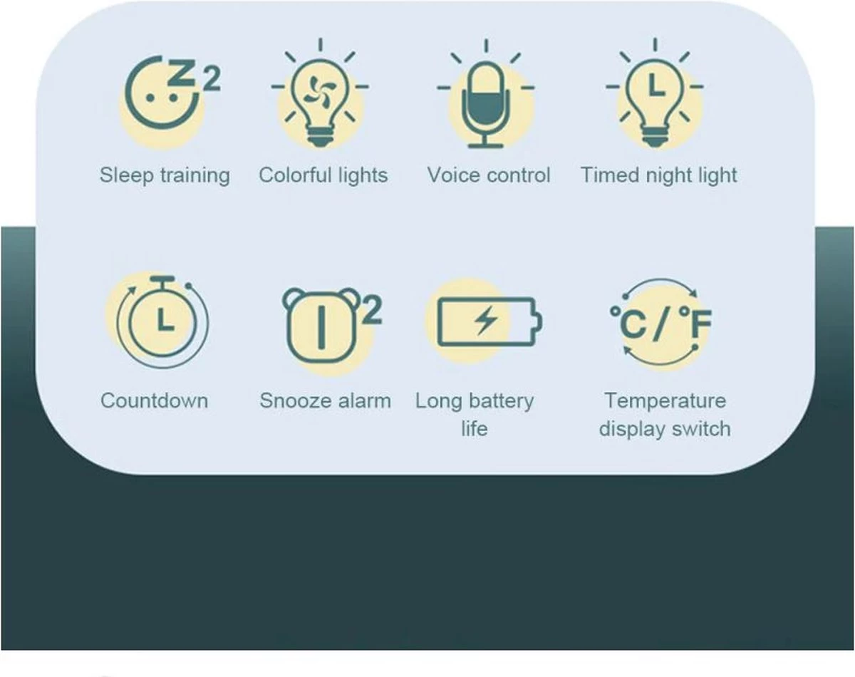 Met deze slaaptrainer zal jouw kind nooit meer te vroeg uit bed gaan of te lang doorslapen! De wekker voor kinderen is voorzien van 6 leuke geluidjes om uit te kiezen en heeft licht dat ’s ochtends steeds feller wordt. Hierdoor wordt je kind op het gewenste tijdstip wakker en weet je kind wanneer hij/zij uit bed mag. Tik op het lampje om de tijd te laten zien. Zo kan je kindje ook zelf zien hoelaat het is! Of klik op het knopje om te horen hoelaat het is. Hiermee leert je kindje ook nog eens klokkijken!
