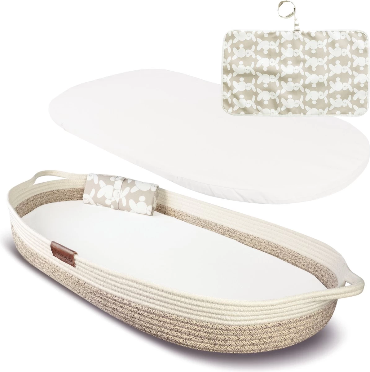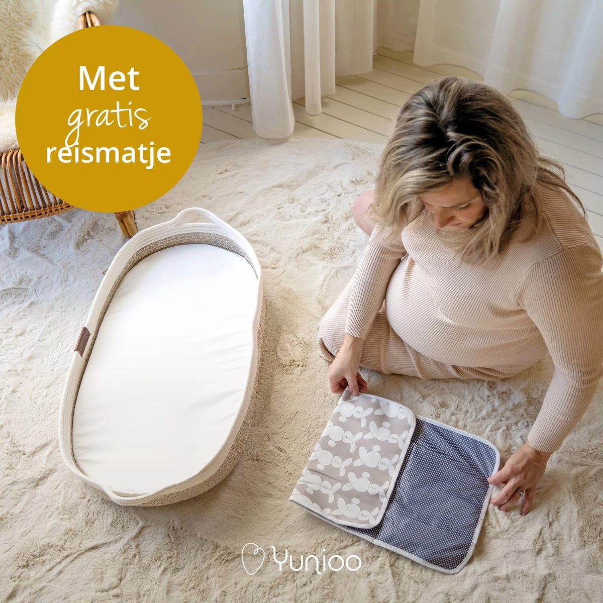 Vergelijkbaar met de populaire mozes mandjes is de Yunioo ‘baby changing basket’ voorzien van handvatten. We hebben ervoor gekozen om deze aan de uiteinden te plaatsen, zodat ze niet in de weg zitten bij het verschonen.