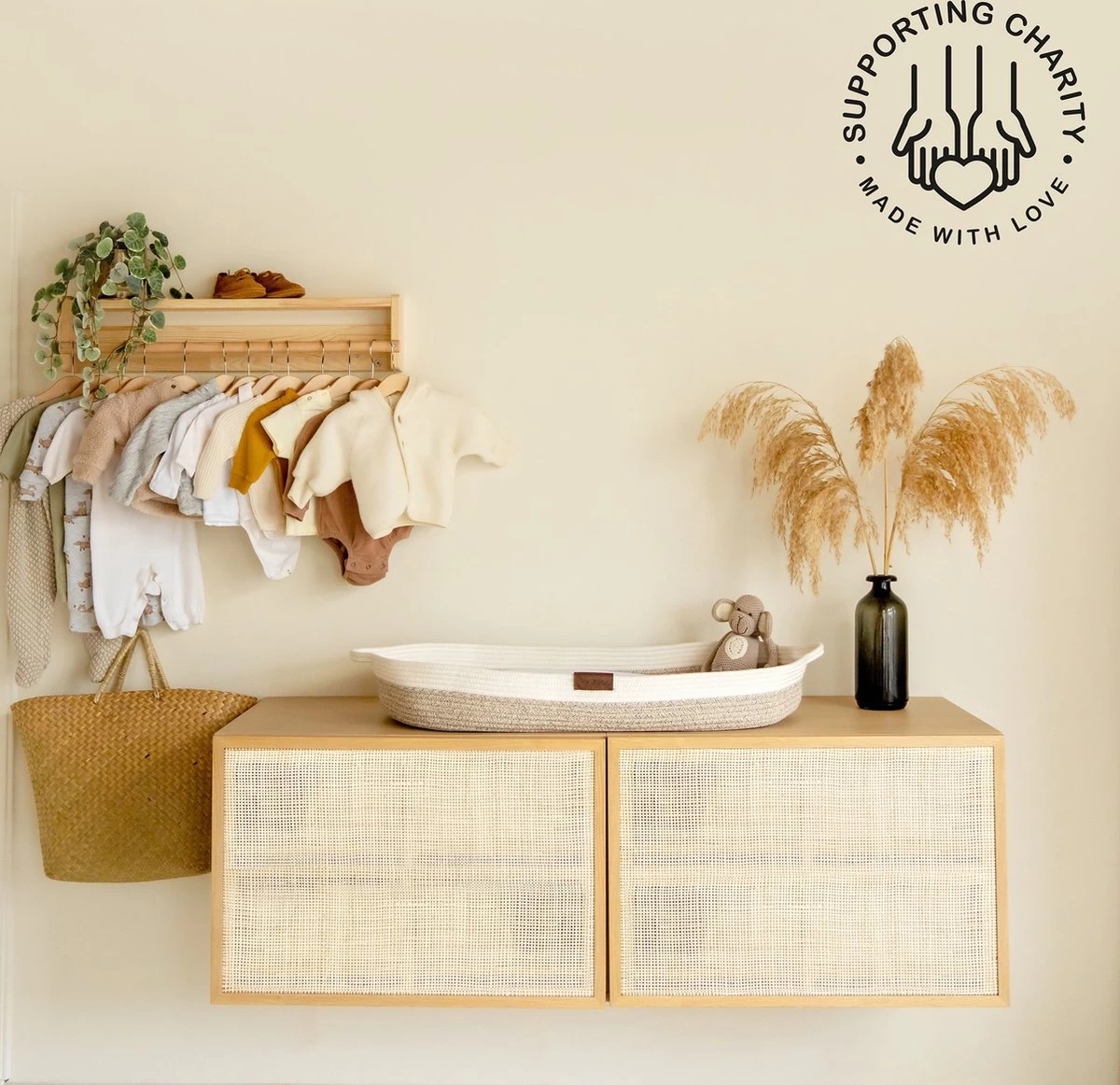 Gemaakt van 70% katoen en 30% polyester. En juist deze combinatie zorgt ervoor dat de mand zowel zacht als stevig aanvoelt en langer meegaat. Gevlochten katoen staat bekend om zijn zachte, flexibele en zeer sterke eigenschappen. Door een beetje polyester toe te voegen behouden we de eigenschappen van het katoen en verbeteren we de stevigheid en duurzaamheid van de mand. In vergelijking met zeegras, bamboe of rotan is gevlochten katoen extra zacht en beschermend voor de gevoelige huid van jouw kleine wondertje.